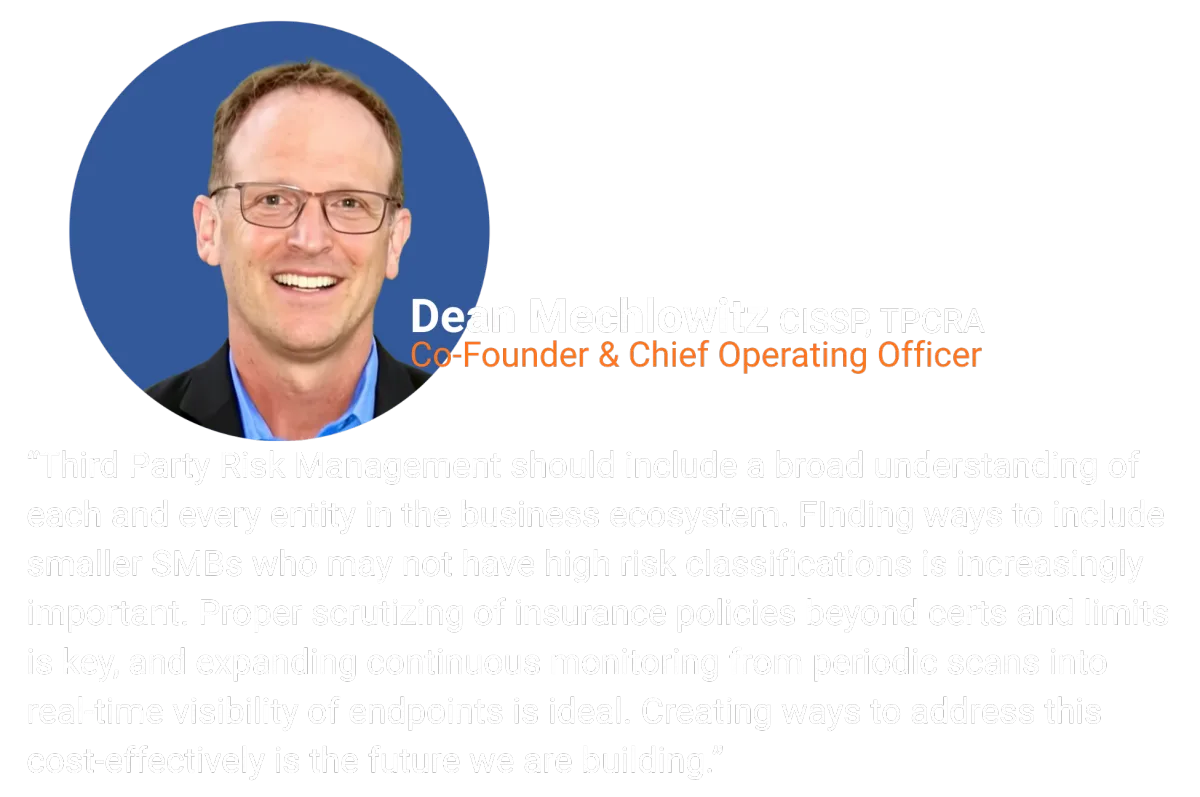 It can be hard to get more headcount for your TPRM Program, but its so critical to accelerate the initiative. Our staff consists of highly experienced business professionals certified in third party risk management practices and cybersecurity. We can augment your exiting team for specific tasks, or work directly with your third parties to assess, remediate or even insure those entities. We can be an operational partner who accelerates process and extends further expertise.